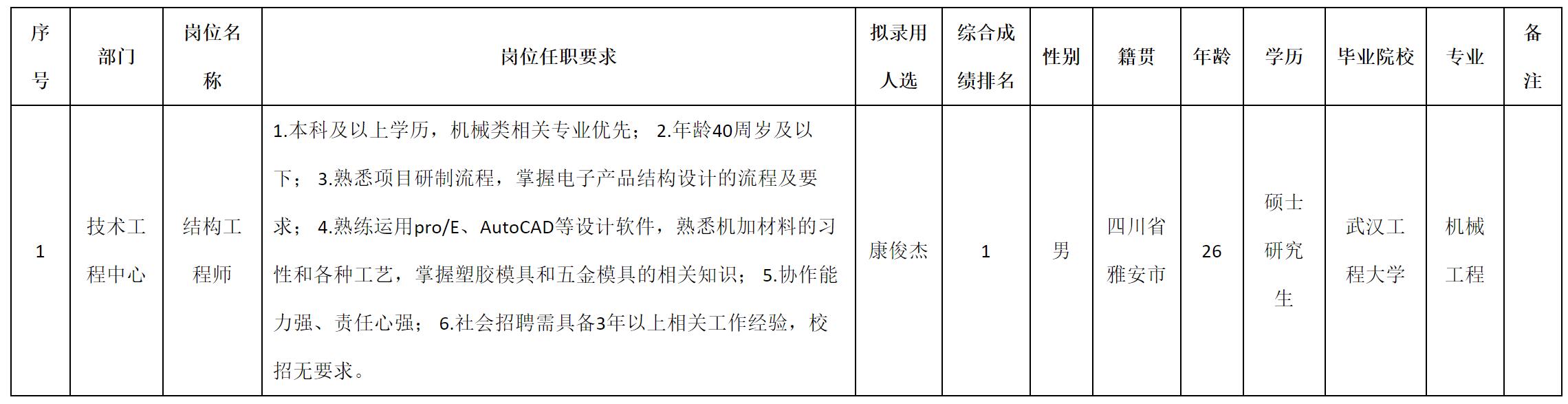 根據(jù)四川九洲光電科技股份有限公司發(fā)布的招聘公告及招聘相關(guān)規(guī)定,經(jīng)測(cè)試、考察、體檢等程序,擬錄用康俊杰同志到四川九洲光電科技股份有限公司工作,現(xiàn)予以公示,具體情況如下: