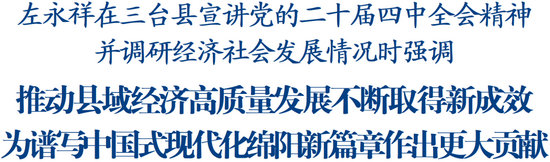 學(xué)習(xí)好貫徹好黨的二十屆四中全會(huì)精神是當(dāng)前和今后一個(gè)時(shí)期的重大政治任務(wù)。調(diào)研中,左永祥深入基層一線向干部群眾宣講全會(huì)精神。他說,黨的二十屆四中全會(huì)是在我們黨團(tuán)結(jié)帶領(lǐng)全黨全國各族人民以中國式現(xiàn)代化全面推進(jìn)強(qiáng)國建設(shè)、民族復(fù)興偉業(yè)的關(guān)鍵時(shí)期召開的一次十分重要的會(huì)議,意義重大、影響深遠(yuǎn)。各地各部門要精心組織傳達(dá)學(xué)習(xí),廣泛開展宣傳宣講,做到學(xué)思踐悟、知行合一。要對標(biāo)對表全會(huì)部署要求,科學(xué)謀劃好“十五五”時(shí)期經(jīng)濟(jì)社會(huì)發(fā)展工作,切實(shí)把全會(huì)精神轉(zhuǎn)化為實(shí)實(shí)在在的成效。期間,左永祥聽取了三臺縣經(jīng)濟(jì)社會(huì)發(fā)展情況匯報(bào),對各項(xiàng)工作取得的成績給予肯定。他指出,三臺縣是全省丘區(qū)農(nóng)業(yè)大縣、百萬人口大縣,歷史文化悠久、產(chǎn)業(yè)基礎(chǔ)良好,要立足資源稟賦,強(qiáng)化系統(tǒng)思維,堅(jiān)持因地制宜,扎實(shí)推進(jìn)以縣城為重要載體的新型城鎮(zhèn)化建設(shè),統(tǒng)籌抓好鄉(xiāng)村全面振興,科學(xué)布局建設(shè)一批優(yōu)質(zhì)均衡的公共服務(wù)設(shè)施,努力走出縣域經(jīng)濟(jì)高質(zhì)量發(fā)展新路徑。要鞏固農(nóng)業(yè)基礎(chǔ)優(yōu)勢,加快農(nóng)業(yè)全產(chǎn)業(yè)鏈培育發(fā)展,高標(biāo)準(zhǔn)建設(shè)現(xiàn)代農(nóng)業(yè)園區(qū),大力發(fā)展現(xiàn)代種業(yè),做大做強(qiáng)農(nóng)業(yè)品牌,積極培育鄉(xiāng)村新產(chǎn)業(yè)新業(yè)態(tài),推動(dòng)農(nóng)業(yè)“接二連三”融合發(fā)展。要提升工業(yè)發(fā)展質(zhì)效,加快“智改數(shù)轉(zhuǎn)”步伐,發(fā)揮龍頭企業(yè)鏈主作用,深入開展產(chǎn)業(yè)招商、以商招商,精準(zhǔn)引進(jìn)上下游企業(yè),推動(dòng)特色優(yōu)勢產(chǎn)業(yè)建圈強(qiáng)鏈,筑牢縣域經(jīng)濟(jì)堅(jiān)實(shí)支撐。要做優(yōu)文旅消費(fèi),依托獨(dú)特文旅資源,發(fā)揮體育賽事活動(dòng)帶動(dòng)作用,創(chuàng)新思路推進(jìn)文商體旅深度融合發(fā)展,增加優(yōu)質(zhì)供給,激發(fā)消費(fèi)活力,不斷滿足人民日益增長的美好生活需要。當(dāng)前,要統(tǒng)籌做好抓項(xiàng)目、擴(kuò)投資、促消費(fèi)、惠民生、保安全等重點(diǎn)工作,全力沖刺四季度,堅(jiān)決完成全年目標(biāo)任務(wù),確保“十四五”圓滿收官、“十五五”良好開局。