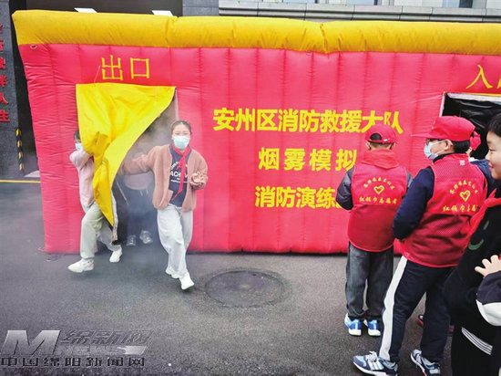 學(xué)生在安州區(qū)消防救援大隊沉浸式學(xué)習(xí)安全技能。