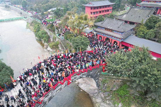 “這個(gè)活動(dòng)包含了很多內(nèi)容,包括在橋上走三遍、娃娃拜獅拜干爹、丟藥錢等民俗活動(dòng)。每年這個(gè)時(shí)候都會(huì)吸引大約20萬人來此踩橋。經(jīng)過200多年的演變,雎水春社踩橋已成為中國(guó)民俗文化活動(dòng)中最有獨(dú)特性的、不可復(fù)制的民俗‘活化石’。2012年該活動(dòng)被評(píng)為‘中國(guó)最具特色民族節(jié)慶’,2017年被評(píng)為‘中國(guó)最具創(chuàng)新價(jià)值節(jié)慶’。”黃長(zhǎng)路告訴記者。