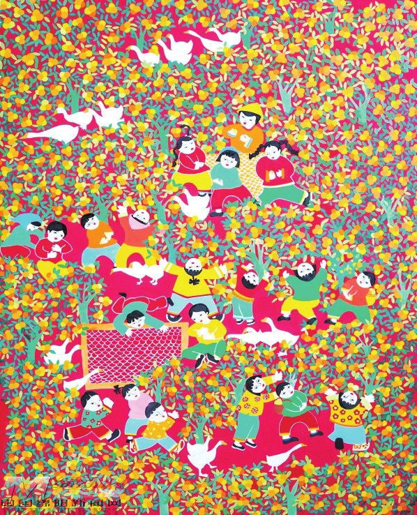 陳維兵的《幸福果農(nóng)》扎根鄉(xiāng)村生活,聚焦勞動場景與幸福生活景象。作品通過夸張的造型和濃烈的色彩,生動刻畫村民協(xié)作勞動的畫面,風(fēng)格吉祥喜慶,傳遞出老百姓樂觀向上的生活追求與審美情趣。畫面色彩絢麗濃烈,裝飾感平和自然,線條簡練利落,既凸顯農(nóng)民畫質(zhì)樸奔放的藝術(shù)特色,也表達了老百姓對美好生活的向往,以及對真善美的渴望與追求。