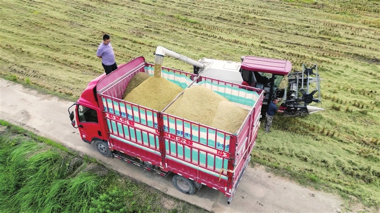 高渠鎮(zhèn)章邦村晚稻收割現(xiàn)場。 記者 彭紫薇 攝