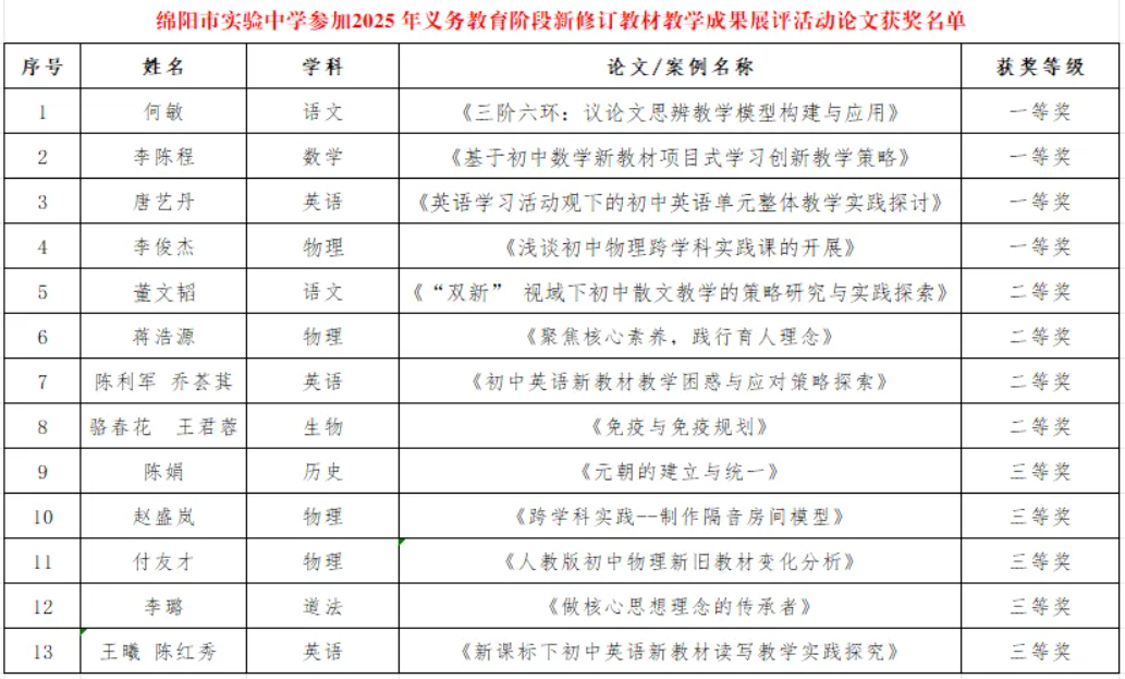 綿陽新聞網(wǎng)訊 11月7日,由綿陽市教育科學研究所精心組織的2025年義務教育階段新修訂教材教學成果展評活動成果揭曉。經(jīng)過評委專家組公開、公平、公正的嚴格評審,綿陽市實驗中學(綿陽七中)多名教師憑借扎實的專業(yè)功底與創(chuàng)新的教學實踐,斬獲多項大獎,成果豐碩。