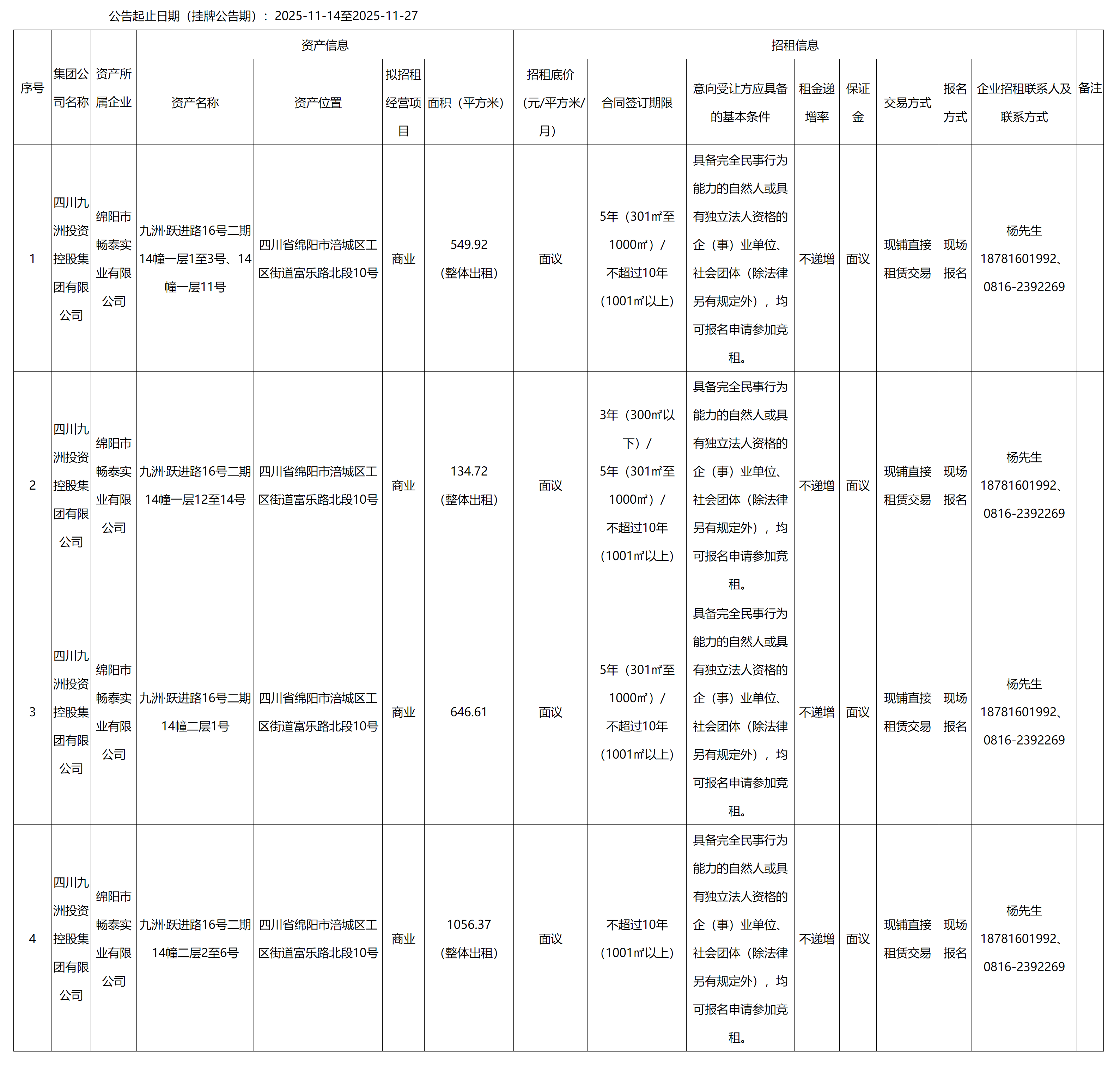 四川九洲千城商業(yè)管理有限公司九洲躍進路16號二期14幢樓商鋪出租公告