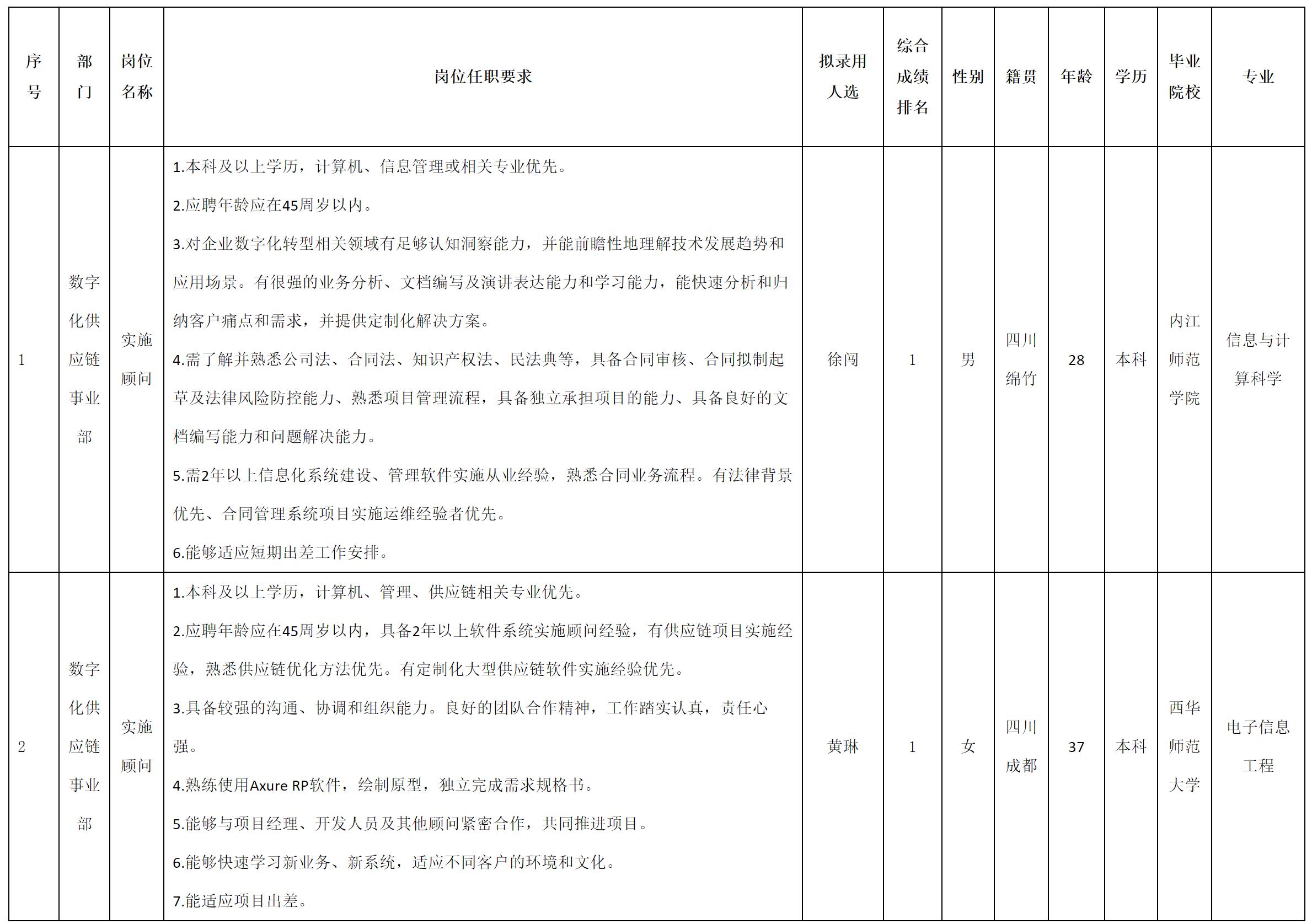 根據(jù)四川虹信軟件股份有限公司發(fā)布的招聘公告及招聘相關(guān)規(guī)定,經(jīng)測試、考察、體檢等程序,擬錄用徐闖、黃琳同志到四川虹信軟件股份有限公司工作,現(xiàn)予以公示,具體情況如下: