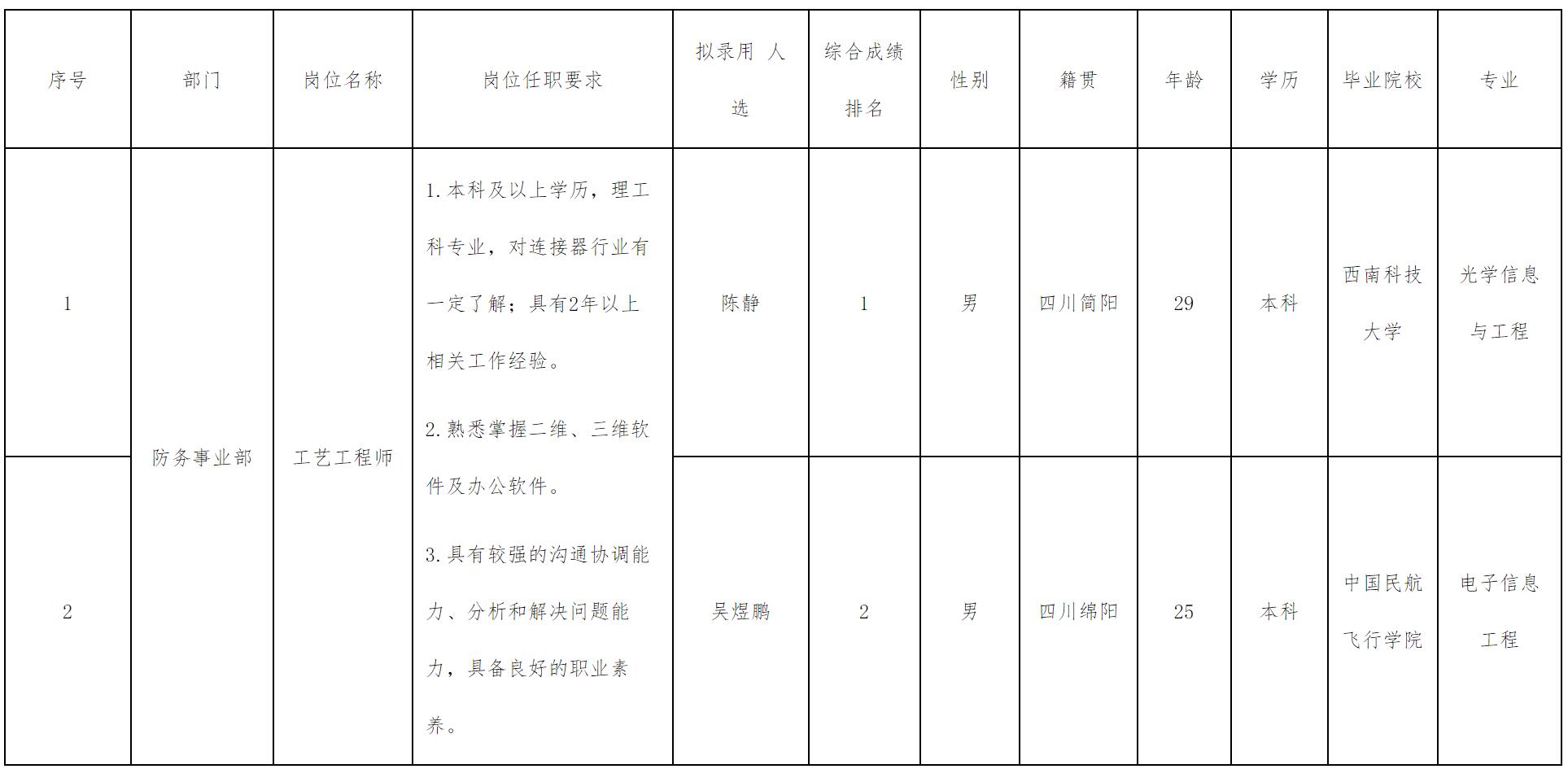 根據(jù)四川華豐科技股份有限公司發(fā)布的招聘公告及招聘相關(guān)規(guī)定,經(jīng)面試、考察、體檢等程序,擬錄用陳靜等同志到四川華豐科技股份有限公司工作,現(xiàn)予以公示,具體情況如下: