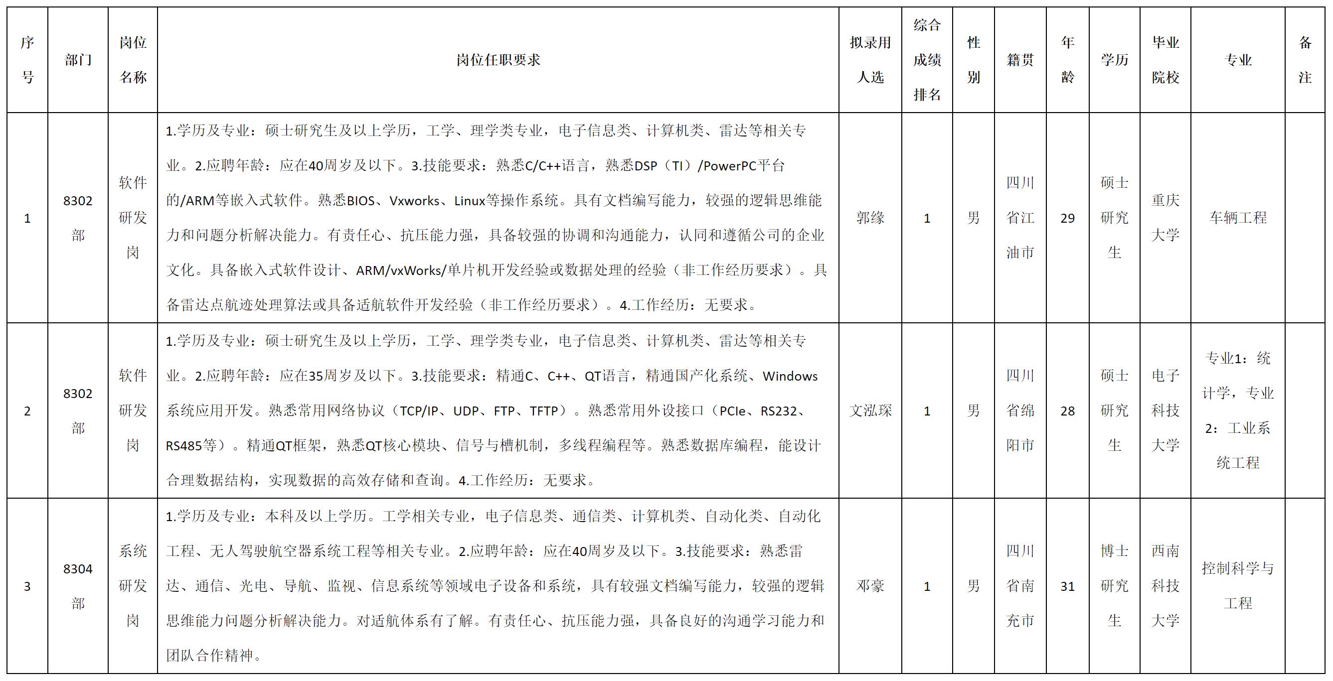 根據四川九洲空管科技有限責任公司發(fā)布的招聘公告及招聘相關規(guī)定,經測試、考察、體檢等程序,擬錄用郭緣等3名同志到四川九洲空管科技有限責任公司工作,現予以公示,具體情況如下: