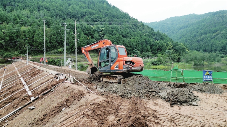挖掘機(jī)開展壩體加固作業(yè)。記者 彭紫薇 攝