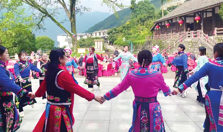 村民們在村里的百年皂角樹下載歌載舞?! ?北川融媒供圖