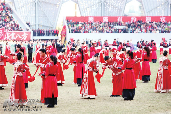 比賽中場(chǎng),在《綿陽之戀》的優(yōu)美旋律中,50對(duì)新人舉行了集體婚禮。 記者 陳冬冬 攝
