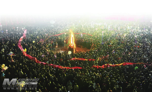萬(wàn)人篝火晚會(huì)上,游客手拉手跳沙朗。 北川融媒供圖