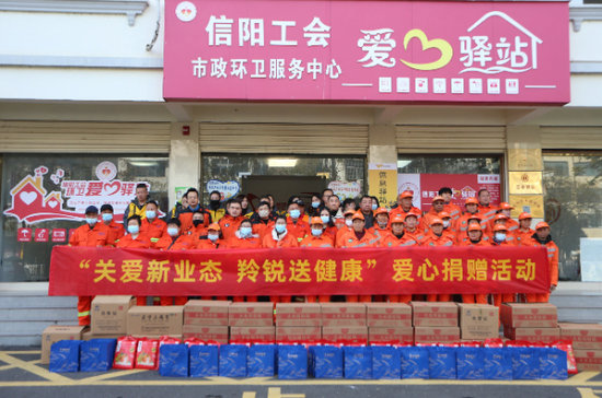 11月22日,正是二十四節(jié)氣的小雪,新縣金蘭山街道康畈社區(qū)內,外賣員、快遞員等新就業(yè)群體代表喜提“冬日暖心禮包”;信陽市政環(huán)衛(wèi)服務中心工會愛心驛站里,羚銳制藥聯(lián)合信陽市總工會舉辦的“關愛新業(yè)態(tài),羚銳送健康”愛心捐贈活動在此展開,為在寒風中堅守崗位的戶外勞動者們送上價值近10萬元的愛心物資,現(xiàn)場掌聲不斷,暖意融融。