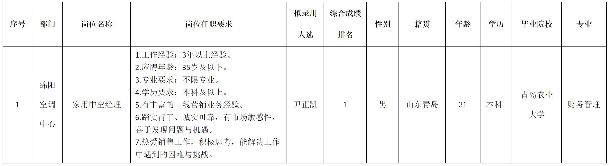 根據(jù)長虹·美菱中國區(qū)營銷總部發(fā)布的招聘公告及招聘相關(guān)規(guī)定,經(jīng)面試、考察、體檢等程序,擬錄用尹正凱同志到公司工作,現(xiàn)予以公示,具體情況如下: