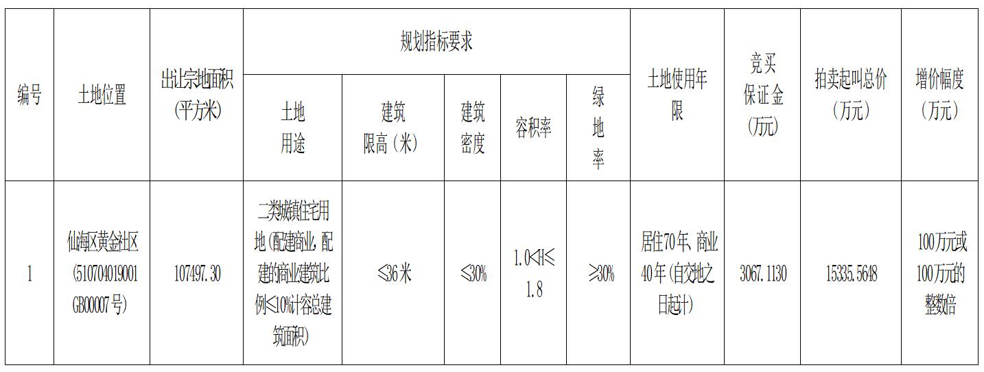 經(jīng)綿陽市人民政府批準(zhǔn),綿陽市仙海水利風(fēng)景區(qū)管理委員會(huì)決定以拍賣方式出讓一宗國有建設(shè)用地使用權(quán),綿陽市公共資源交易服務(wù)中心具體組織實(shí)施本次拍賣出讓活動(dòng),現(xiàn)將有關(guān)事項(xiàng)公告如下: