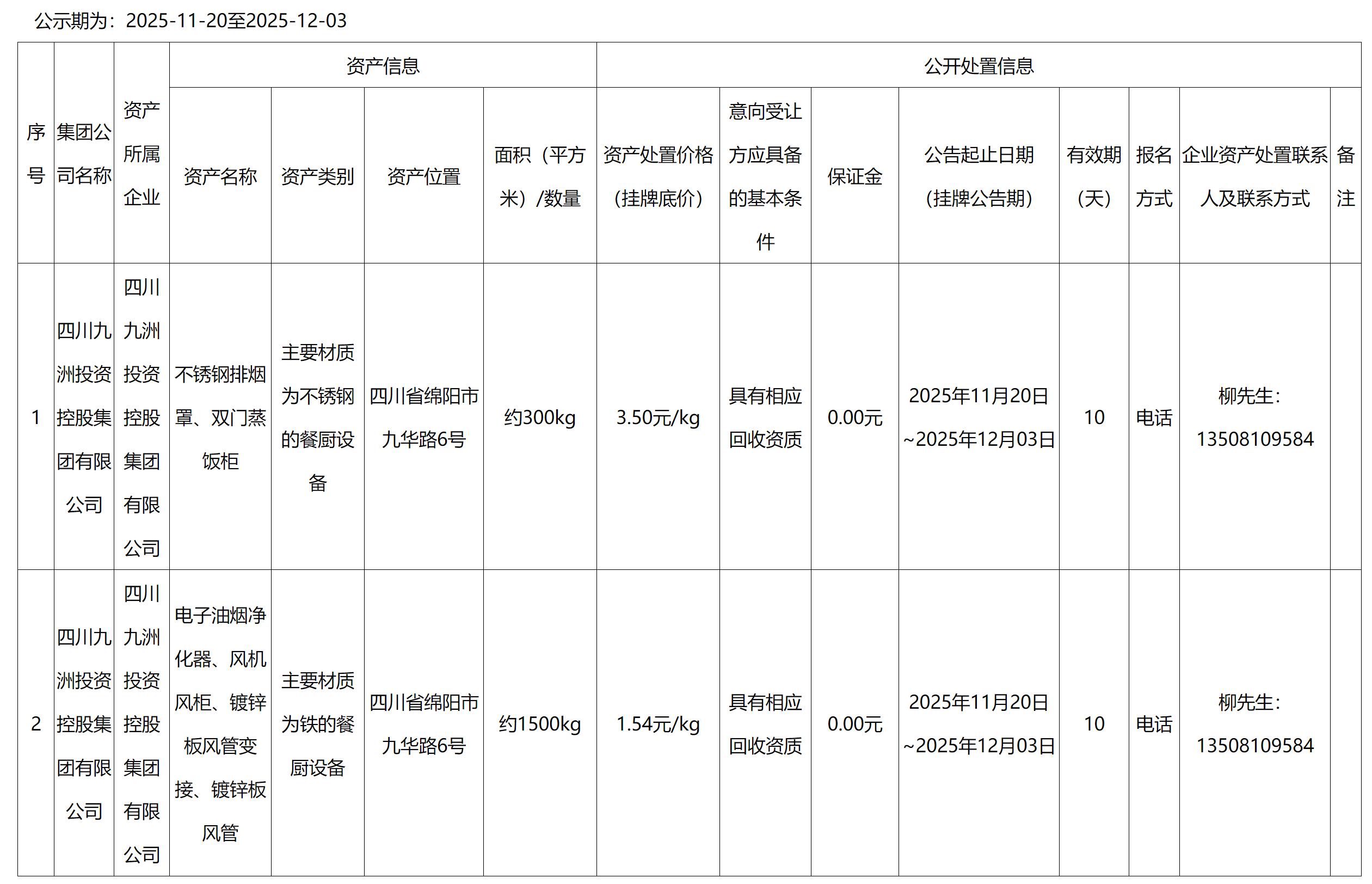 四川九洲投資控股集團有限公司不銹鋼排煙罩等資產(chǎn)處置公告