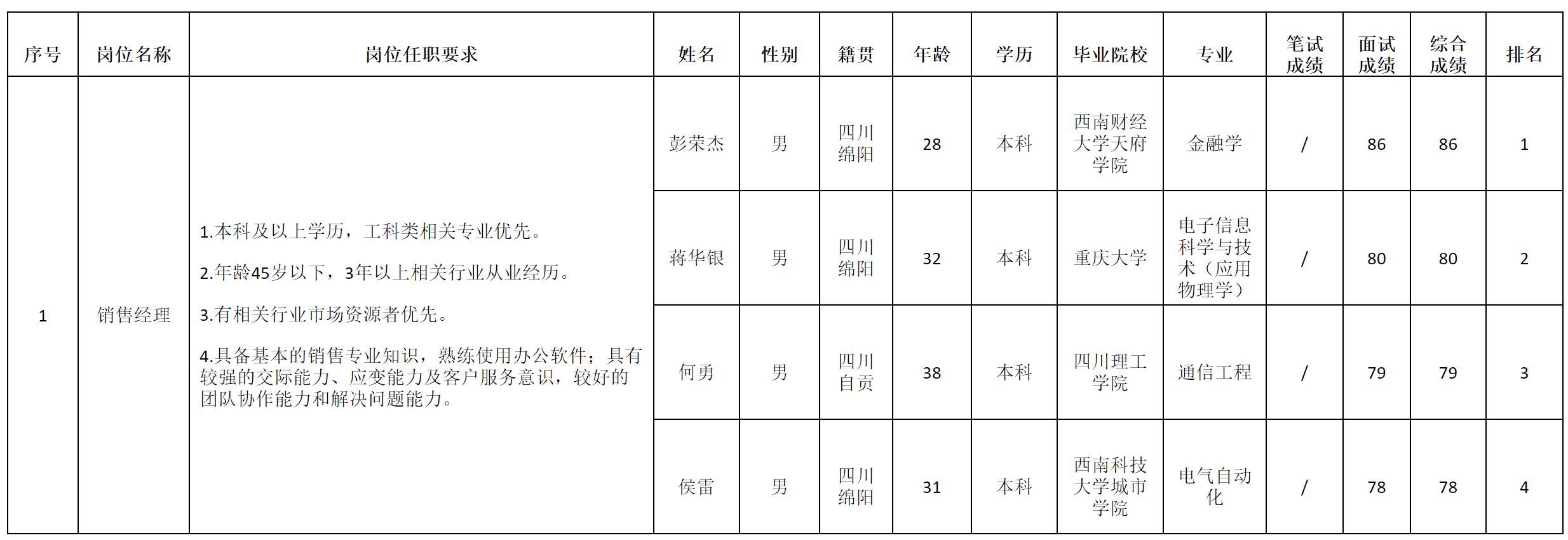 根據(jù)四川長虹電子科技有限公司發(fā)布的招聘公告及招聘相關規(guī)定,經(jīng)面試等程序,現(xiàn)將面試成績予以公示。