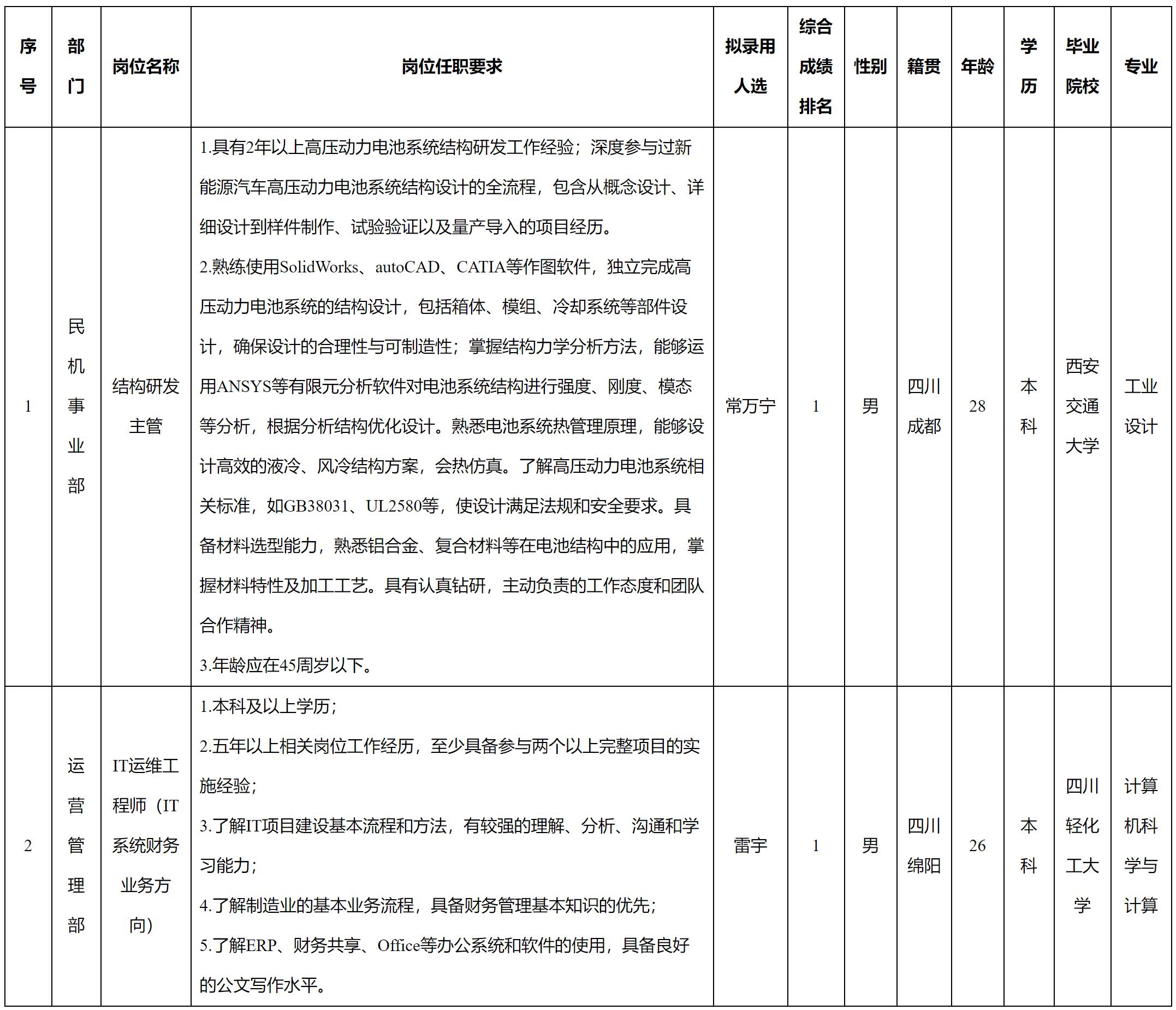 根據(jù)四川長(zhǎng)虹電源股份有限公司發(fā)布的招聘公告及招聘相關(guān)規(guī)定,經(jīng)測(cè)試、考察、體檢等程序,擬錄用常萬(wàn)寧、雷宇同志到我司工作,現(xiàn)予以公示,具體情況如下: