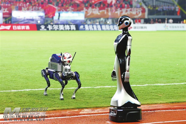 “綿陽(yáng)造”機(jī)器狼運(yùn)送比賽用球至嘉賓處。 記者 陳冬冬 攝