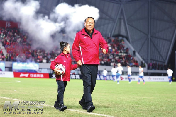 10月25日晚,川超綿陽(yáng)九洲長(zhǎng)虹隊(duì)對(duì)陣廣元?jiǎng)﹂T(mén)雄關(guān)隊(duì)的比賽現(xiàn)場(chǎng),中國(guó)工程物理研究院(簡(jiǎn)稱(chēng)“中物院”)老一輩科研工作者子弟、四川省足球協(xié)會(huì)原秘書(shū)長(zhǎng)李日新,與中物院新生代科研工作者子女、綿陽(yáng)科學(xué)城春蕾學(xué)校學(xué)生韓思媛,攜手為比賽開(kāi)球。