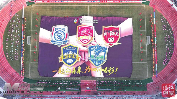 11月23日,綿陽(yáng)九洲長(zhǎng)虹隊(duì)主場(chǎng)對(duì)陣阿壩雪山雄鷹隊(duì)。圖為川北5支球隊(duì)的巨型Tifo(看臺(tái)拼圖)在體育場(chǎng)中間展開(kāi)。 視覺(jué)綿陽(yáng)資料圖片