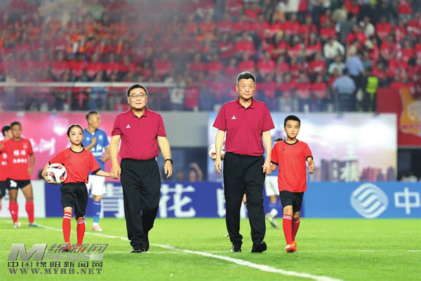 10月7日晚,在三臺(tái)縣體育場(chǎng),“兩彈元?jiǎng)?rdquo;鄧稼先之子鄧志平、“兩彈元?jiǎng)?rdquo;于敏之子于辛為川超聯(lián)賽綿陽(yáng)主場(chǎng)首場(chǎng)比賽開(kāi)球。 記者 陳冬冬 攝