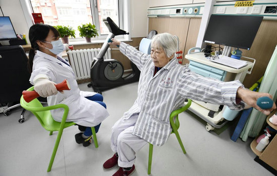3月28日,一名老年居民在朝陽區(qū)安貞社區(qū)衛(wèi)生服務中心的醫(yī)務人員指導下進行康復訓練。新華社記者 李欣 攝