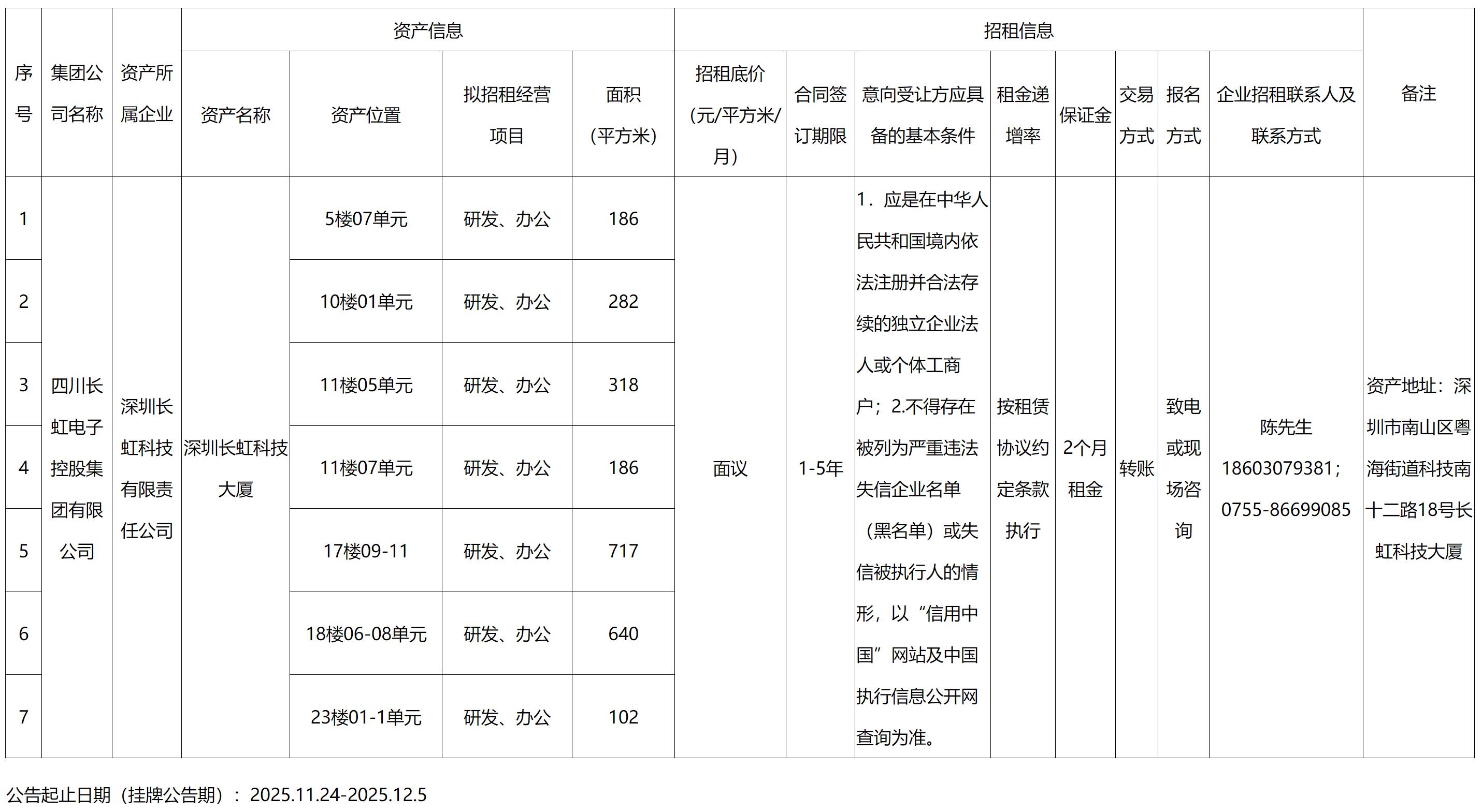 深圳長虹科技有限責任公司資產(chǎn)出租公告
