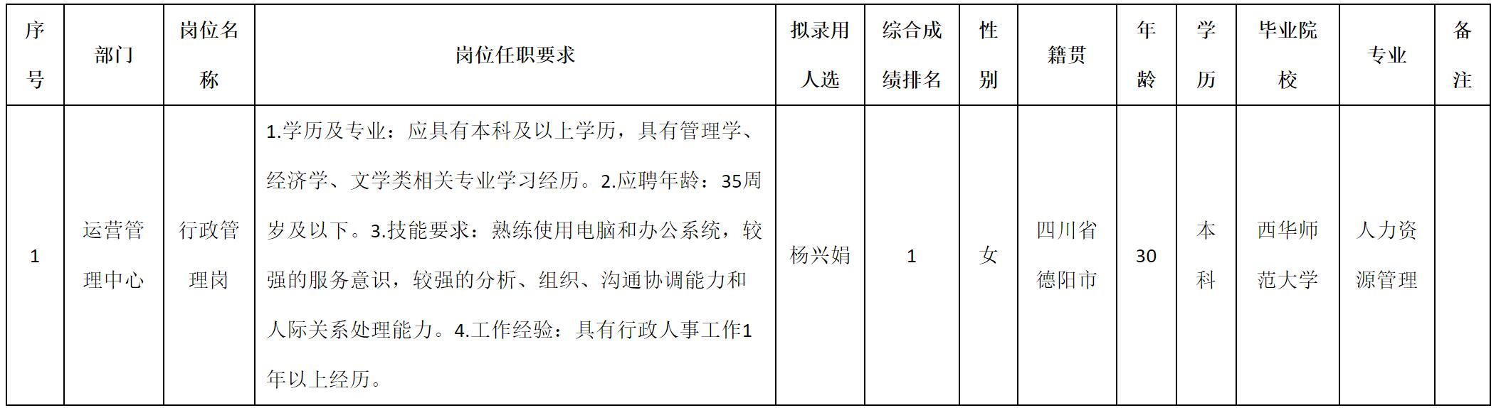 根據(jù)四川九州光電子技術(shù)有限公司發(fā)布的招聘公告及招聘相關(guān)規(guī)定,經(jīng)測(cè)試、考察、體檢等程序,擬錄用楊興娟同志到四川九州光電子技術(shù)有限公司工作,現(xiàn)予以公示,具體情況如下:
