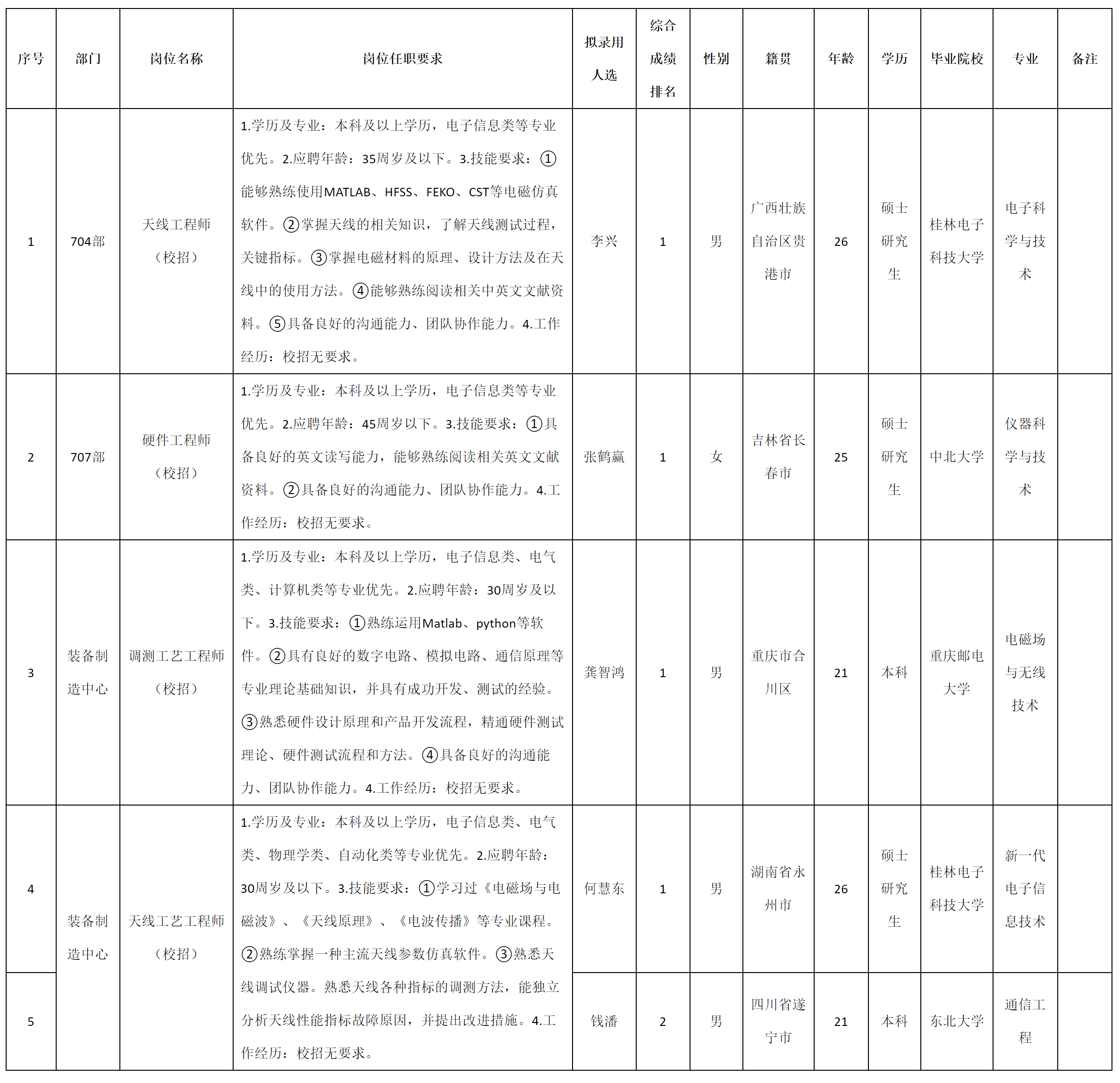 根據(jù)四川九洲電器集團有限責任公司發(fā)布的招聘公告及招聘相關(guān)規(guī)定,經(jīng)測試、考察、體檢等程序,擬錄用李興等5名同志到四川九洲電器集團有限責任公司工作,現(xiàn)予以公示,具體情況如下: