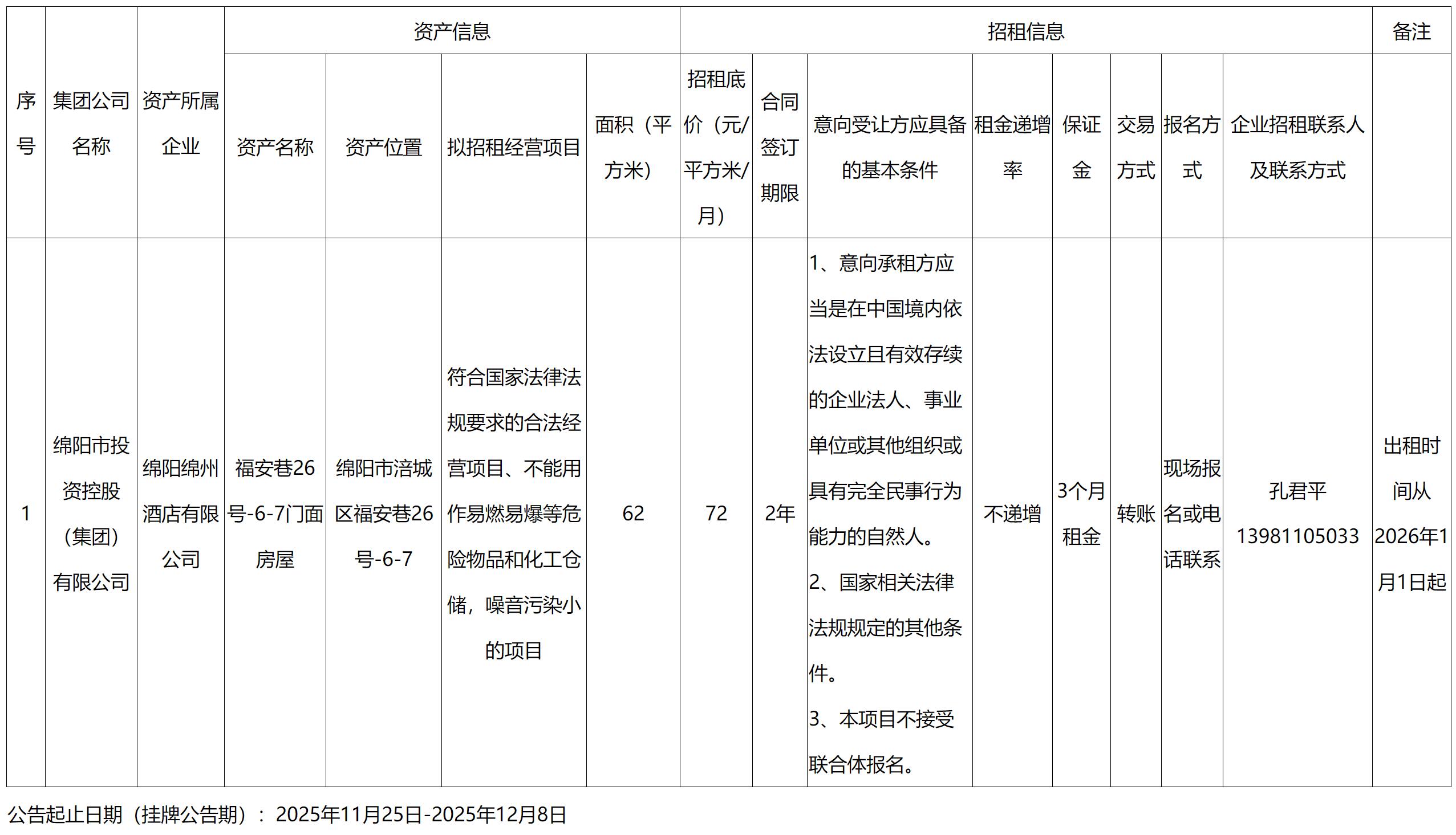 綿陽綿州酒店有限公司資產(chǎn)招租信息公告