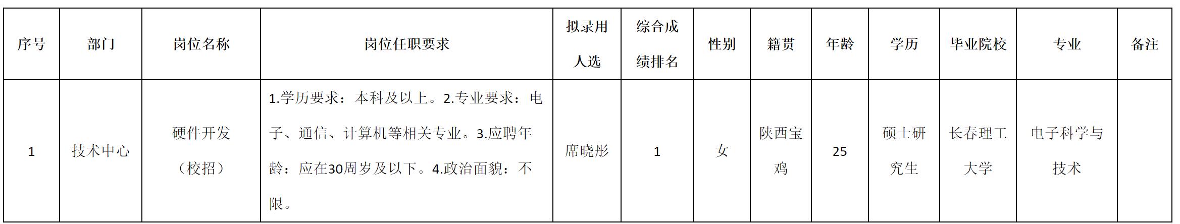根據(jù)四川九州電子科技股份有限公司發(fā)布的招聘公告及招聘相關(guān)規(guī)定,經(jīng)測(cè)試、考察、體檢等程序,擬錄用席曉彤同志到四川九州電子科技股份有限公司工作,現(xiàn)予以公示,具體情況如下: