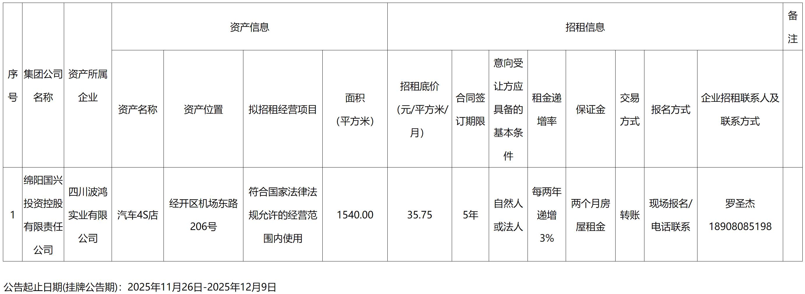 綿陽國興投資控股有限責(zé)任公司資產(chǎn)出租公告