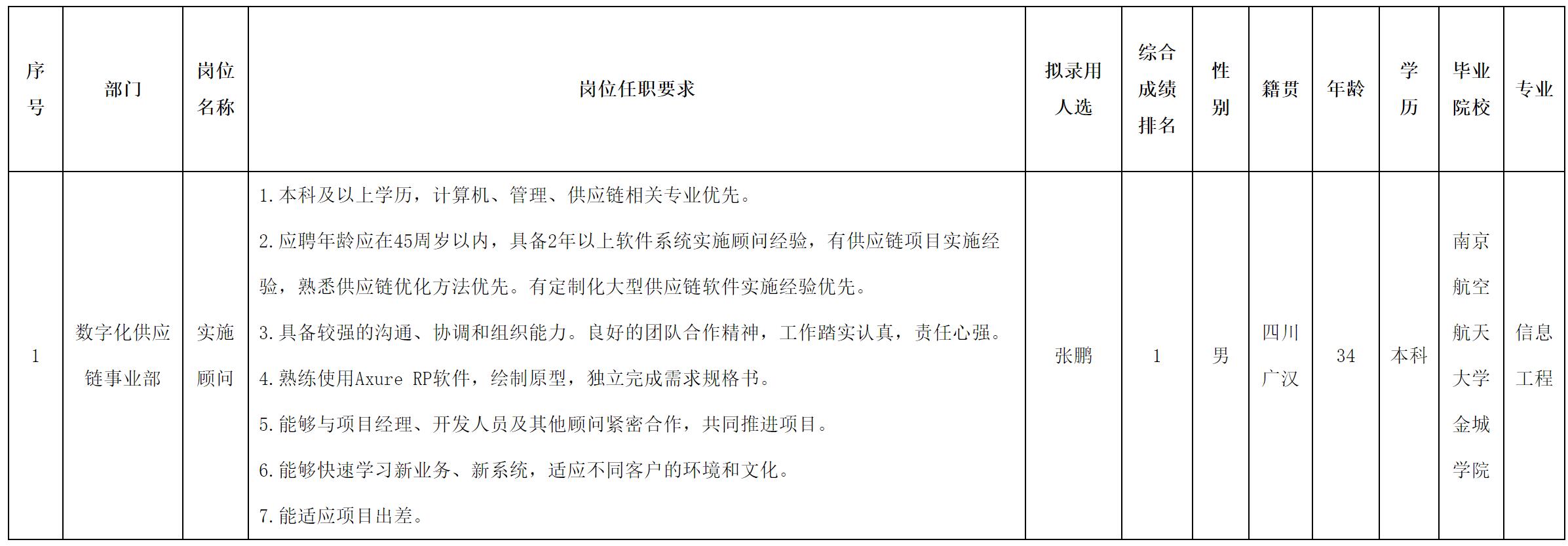 根據(jù)四川虹信軟件股份有限公司發(fā)布的招聘公告及招聘相關(guān)規(guī)定,經(jīng)測試、考察、體檢等程序,擬錄用張鵬同志到四川虹信軟件股份有限公司工作,現(xiàn)予以公示,具體情況如下: