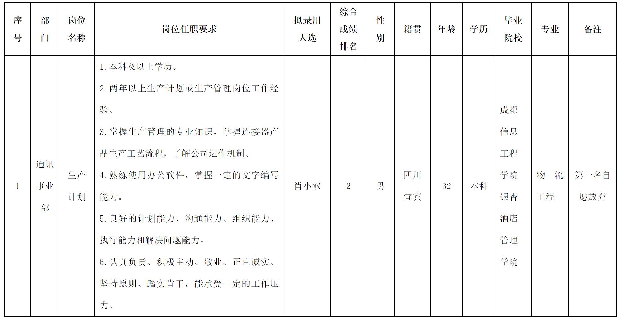 根據(jù)四川華豐科技股份有限公司發(fā)布的招聘公告及招聘相關(guān)規(guī)定,經(jīng)測試等程序,擬錄用肖小雙同志到四川華豐科技股份有限公司工作,現(xiàn)予以公示,具體情況如下: