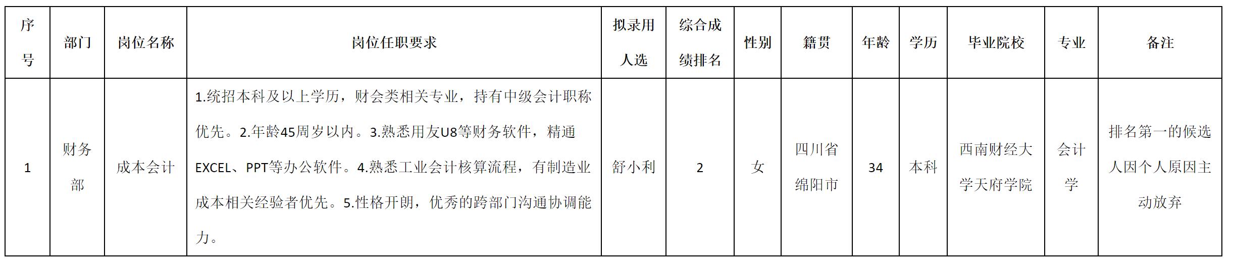 根據(jù)四川安和精密電子電器股份有限公司發(fā)布的招聘公告及招聘相關(guān)規(guī)定,經(jīng)測試、考察、體檢等程序,擬錄用舒小利同志到四川安和精密電子電器股份有限公司工作,現(xiàn)予以公示,具體情況如下: