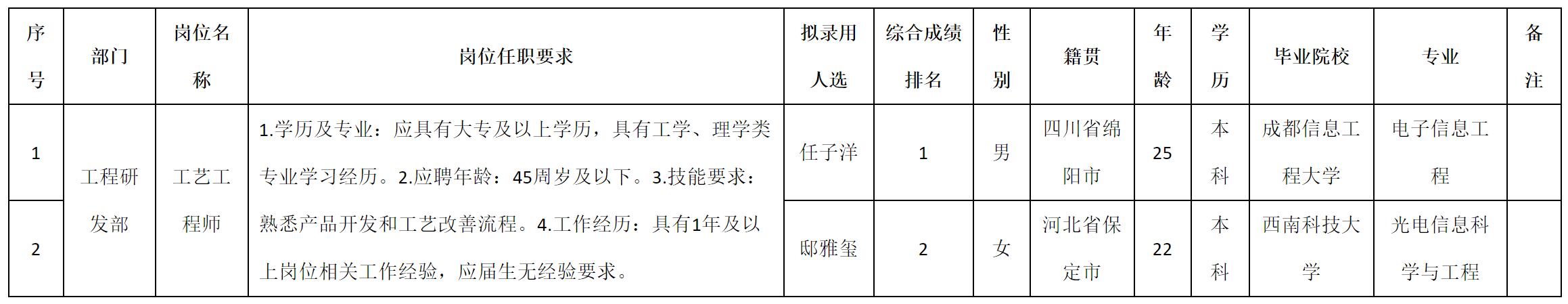 根據(jù)四川九華光子通信技術(shù)有限公司發(fā)布的招聘公告及招聘相關(guān)規(guī)定,經(jīng)測試、考察、體檢等程序,擬錄用任子洋等2名同志到四川九華光子通信技術(shù)有限公司工作,現(xiàn)予以公示,具體情況如下: