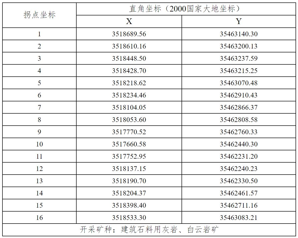 由16個(gè)拐點(diǎn)坐標(biāo)圈閉(見(jiàn)下表),礦區(qū)總面積:0.434平方公里,開采標(biāo)高:+970m至+785m