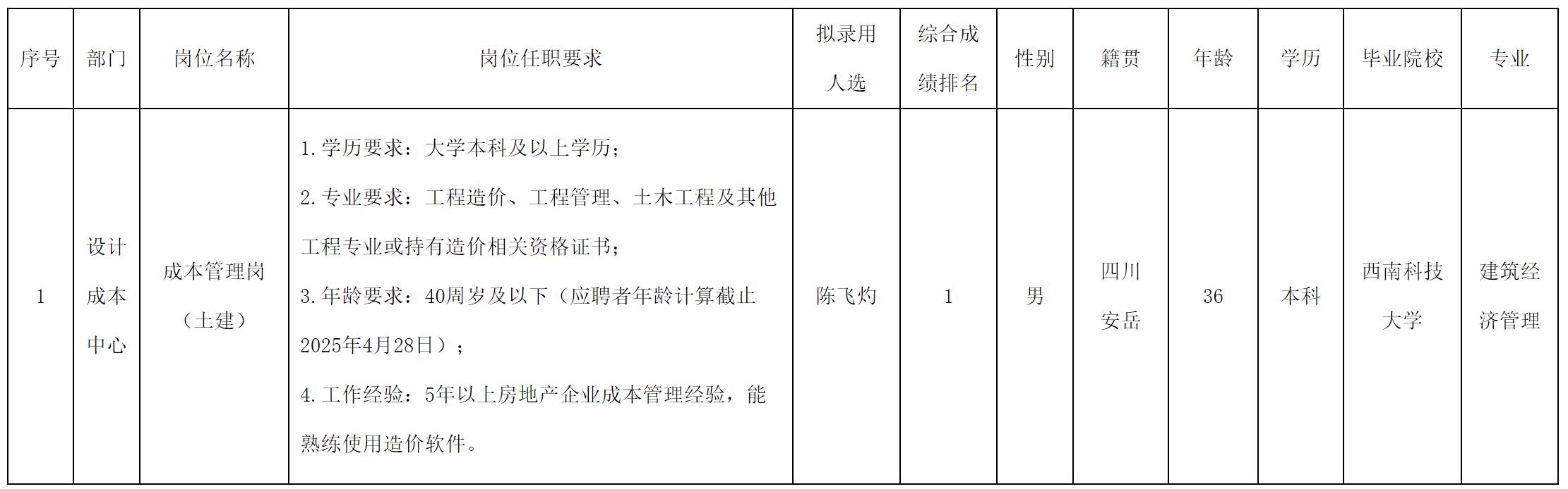 根據(jù)綿陽市綿投置地有限公司發(fā)布的招聘公告及招聘相關(guān)規(guī)定,經(jīng)筆試、面試、考察、體檢等程序,擬錄用陳飛灼同志到綿陽市綿投置地有限公司工作,現(xiàn)予以公示,具體情況如下: