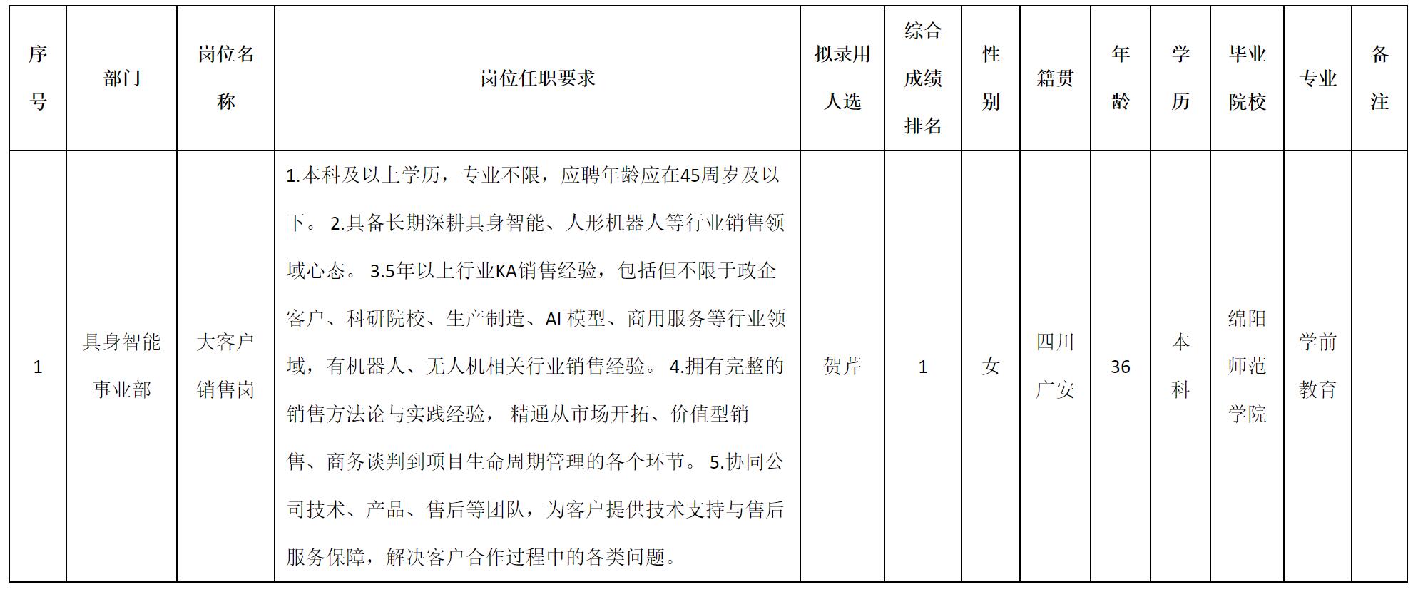 根據(jù)四川九洲投資控股集團(tuán)有限公司軟件與數(shù)據(jù)智能軍團(tuán)發(fā)布的招聘公告及招聘相關(guān)規(guī)定,經(jīng)測(cè)試、考察、體檢等程序,擬錄用賀芹同志到四川九洲投資控股集團(tuán)有限公司軟件與數(shù)據(jù)智能軍團(tuán)工作,現(xiàn)予以公示,具體情況如下: