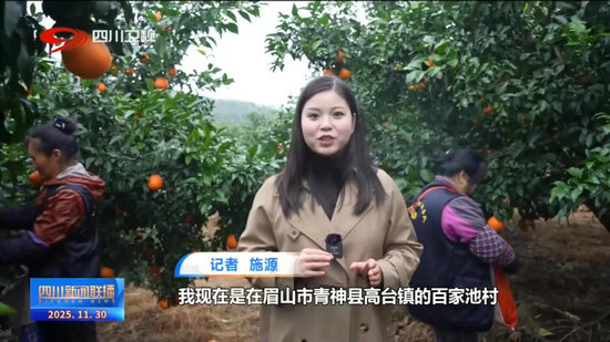 記者 施源:現(xiàn)在正值晚熟柑橘的豐收季,我現(xiàn)在是在眉山市青神縣高臺(tái)鎮(zhèn)的百家池村。這里有一個(gè)晚熟柑橘基地,柑橘品種多達(dá)9種,而種植面積達(dá)3000多畝。