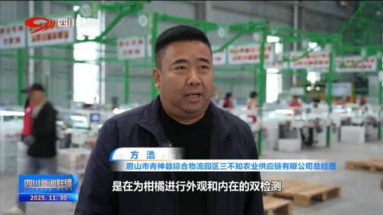 眉山市青神縣綜合物流園區(qū)三不知農(nóng)業(yè)供應(yīng)鏈有限公司總經(jīng)理 方浩:智能分選設(shè)備它主要的功能是在為柑橘進(jìn)行外觀和內(nèi)在的雙檢測(cè)。目前像這樣的分選線,在我們的物流車間大概有五條左右,每天可以分選柑橘大概在50萬斤到80萬斤。