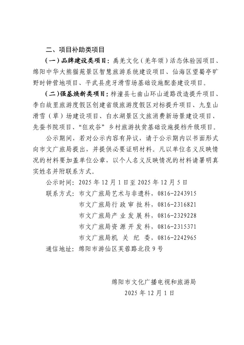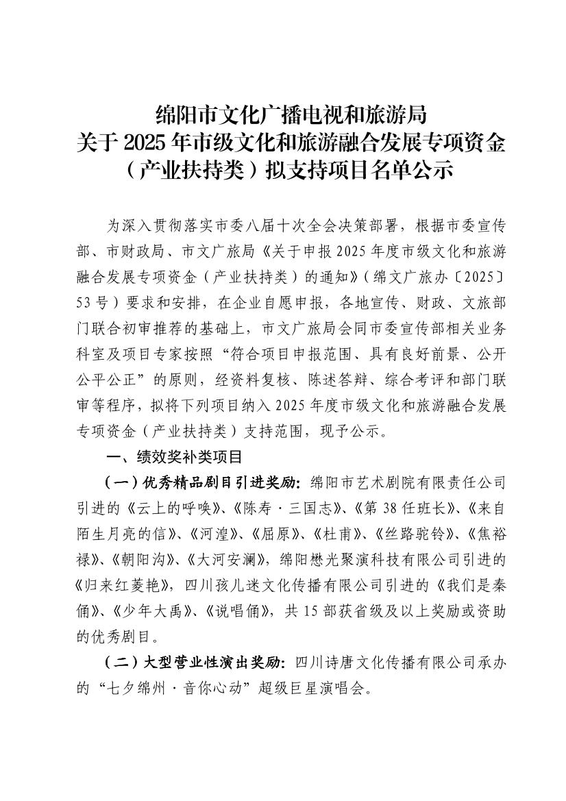綿陽市文化廣播電視和旅游局 關于2025年市級文化和旅游融合發(fā)展專項資金(產(chǎn)業(yè)扶持類)擬支持項目名單公示