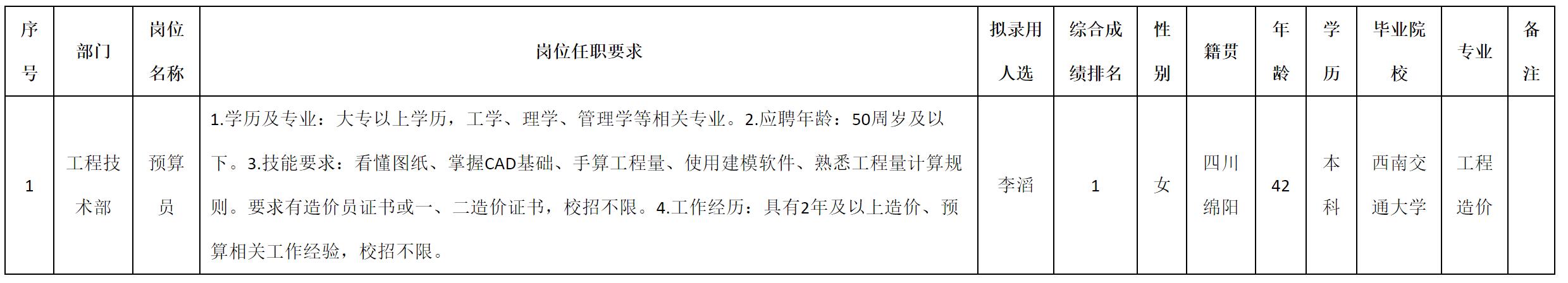 根據(jù)四川九洲建筑工程有限責(zé)任公司發(fā)布的招聘公告及招聘相關(guān)規(guī)定,經(jīng)測(cè)試、考察、體檢等程序,擬錄用李滔同志到四川九洲建筑工程有限責(zé)任公司工作,現(xiàn)予以公示,具體情況如下: