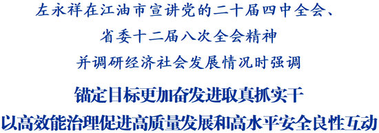 綿陽新聞網(wǎng)訊 12月2日,省委常委、市委書記左永祥前往江油市宣講黨的二十屆四中全會(huì)、省委十二屆八次全會(huì)精神并調(diào)研經(jīng)濟(jì)社會(huì)發(fā)展情況。他強(qiáng)調(diào),要深入學(xué)習(xí)貫徹習(xí)近平總書記對(duì)四川工作系列重要指示精神,全面落實(shí)黨中央、國務(wù)院和省委、省政府決策部署,堅(jiān)持抓發(fā)展、惠民生、保安全,錨定目標(biāo)更加奮發(fā)進(jìn)取、真抓實(shí)干,以高效能治理促進(jìn)高質(zhì)量發(fā)展和高水平安全良性互動(dòng),凝心聚力為綿陽現(xiàn)代化建設(shè)作出更大貢獻(xiàn)。