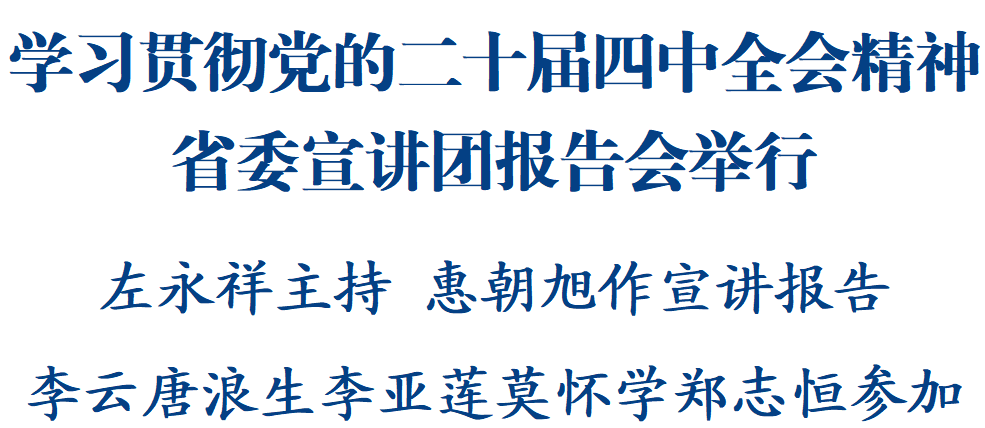 報告會上,惠朝旭圍繞習(xí)近平總書記在黨的二十屆四中全會上的重要講話和《中共中央關(guān)于制定國民經(jīng)濟(jì)和社會發(fā)展第十五個五年規(guī)劃的建議》,對“十四五”時期我國發(fā)展取得的重大成就,“十五五”時期經(jīng)濟(jì)社會發(fā)展的重大意義、指導(dǎo)方針、主要目標(biāo)、戰(zhàn)略任務(wù)、重大舉措以及根本保證進(jìn)行了全面宣講和系統(tǒng)闡釋。惠朝旭表示,黨的二十屆四中全會是在我國即將進(jìn)入基本實現(xiàn)社會主義現(xiàn)代化夯實基礎(chǔ)、全面發(fā)力的關(guān)鍵時期,召開的一次十分重要的會議。全會取得重大成果、作出重大部署,是乘勢而上、接續(xù)推進(jìn)中國式現(xiàn)代化建設(shè)的又一次總動員、總部署,充分體現(xiàn)了以習(xí)近平同志為核心的黨中央團(tuán)結(jié)帶領(lǐng)全黨全國各族人民續(xù)寫經(jīng)濟(jì)快速發(fā)展和社會長期穩(wěn)定兩大奇跡新篇章、奮力開創(chuàng)中國式現(xiàn)代化建設(shè)新局面的歷史主動。他強(qiáng)調(diào),要把學(xué)習(xí)貫徹黨的二十屆四中全會精神同學(xué)習(xí)領(lǐng)會習(xí)近平新時代中國特色社會主義思想和習(xí)近平總書記對四川工作系列重要指示精神貫通起來,與學(xué)習(xí)貫徹省委十二屆八次全會精神結(jié)合起來,在對標(biāo)對表中結(jié)合本地實際謀劃好未來五年發(fā)展藍(lán)圖。