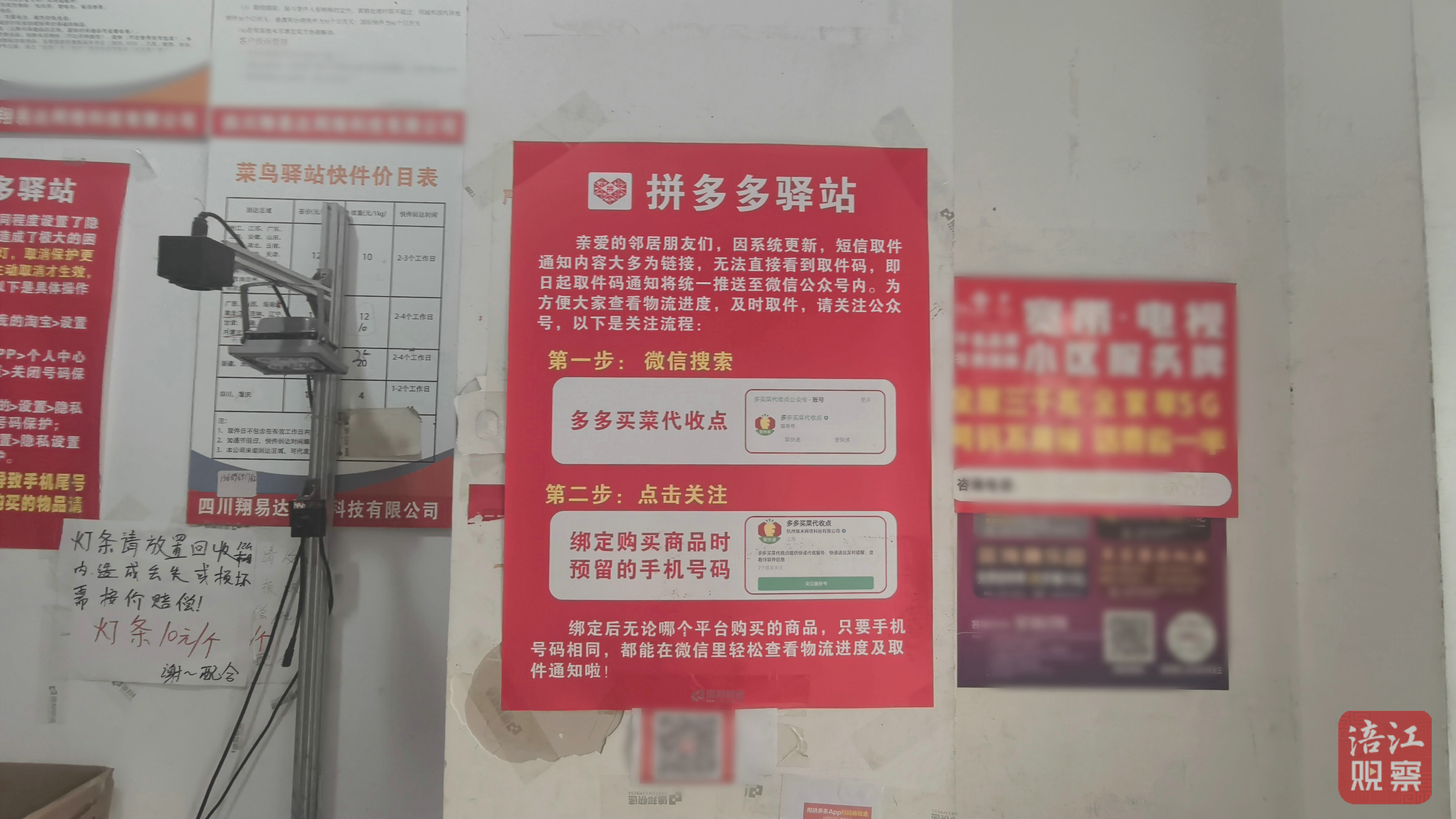 除了下載APP外,也有驛站引導(dǎo)用戶(hù)關(guān)注微信公眾號(hào)。在江油市濱江華城快遞驛站內(nèi),記者看到市民需先微信關(guān)注“多多買(mǎi)菜代收點(diǎn)”,綁定購(gòu)買(mǎi)商品時(shí)預(yù)留的手機(jī)號(hào)碼后,也能獲得所有取件碼。