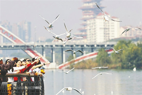 11月27日,綿陽三江湖碼頭,紅嘴鷗翩躚起舞,與市民親密互動。記者 陳冬冬 攝