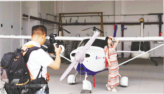 在北川永昌機場機庫內(nèi),游客在飛機機身前拍照留念。視覺綿陽資料圖片