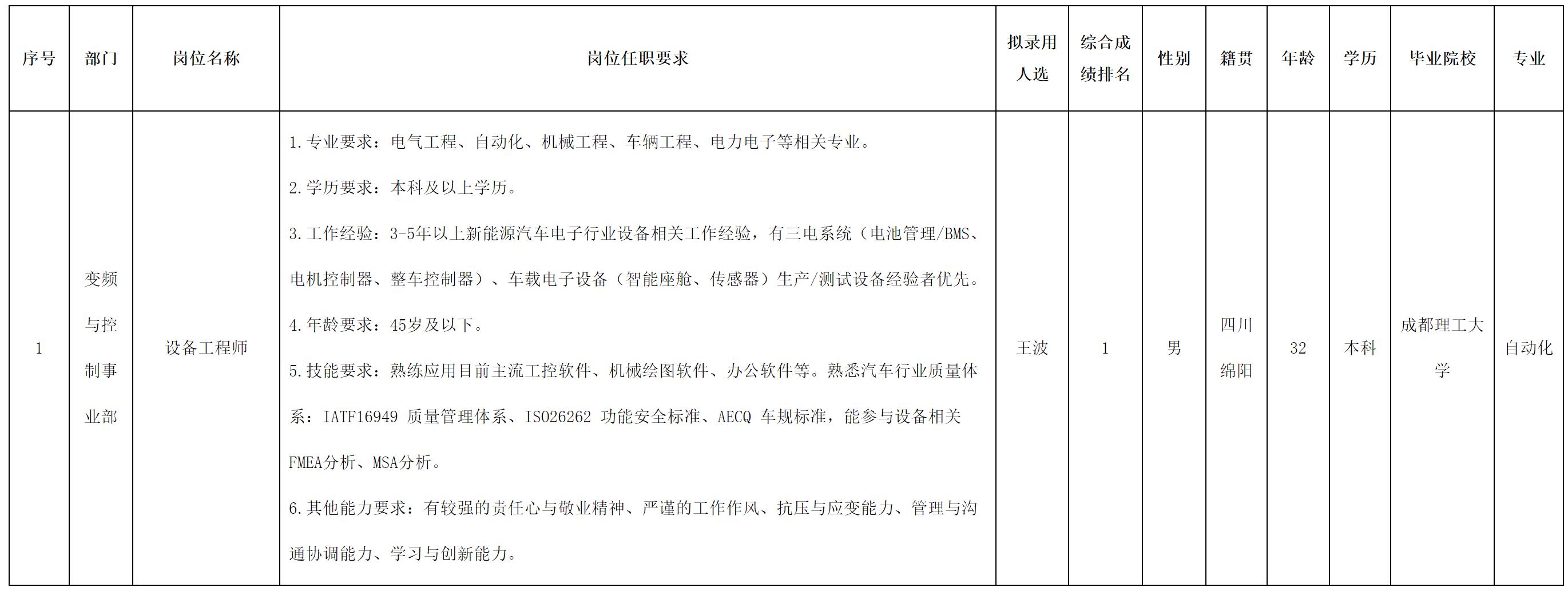 根據(jù)四川愛創(chuàng)科技有限公司發(fā)布的招聘公告及招聘相關規(guī)定,經(jīng)面試、考察、體檢等程序,擬錄用王波同志到變頻與控制事業(yè)部工作,現(xiàn)予以公示,具體情況如: