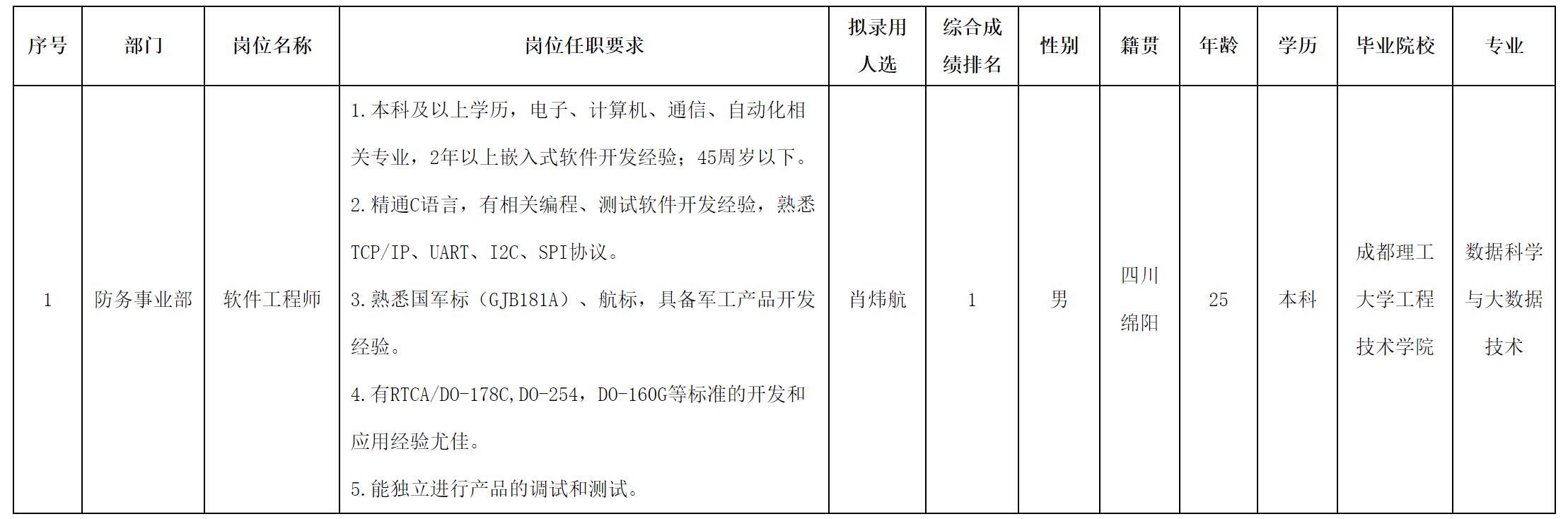根據(jù)四川華豐科技股份有限公司發(fā)布的招聘公告及招聘相關(guān)規(guī)定,經(jīng)面試、考察、體檢等程序,擬錄用肖煒航同志到四川華豐科技股份有限公司工作,現(xiàn)予以公示,具體情況如下: